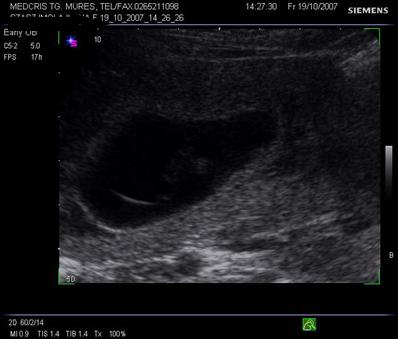 Fig. nr. 208. Placenta gr O la 16 saptamani gestationale, cu sageata se remarca insertia centrala placentara , a cordonului ombilical
