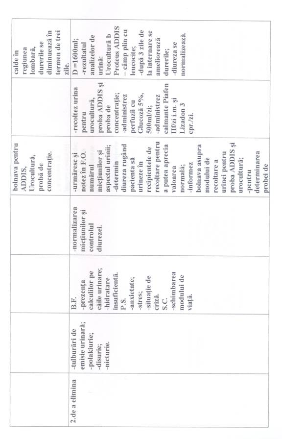 Motivele pentru care pacienta s-a internat in spital sunt: durere in loja renala stanga cu iradiere pe ureter, polakiurie cu nicturie, astenie fizica si psihica.