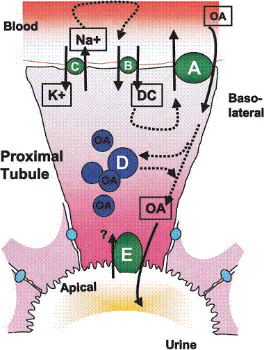 Multe medicamente sau metabolitii lor se prezinta ca anioni organici la pH fiziologic. Acesti compusi sunt vehiculati de sisteme cu afinitate pentru anionii organici din rinichi, ficat, plexul coroid. Cea mai studiata cale secretorie este prin tubul proximal renal.