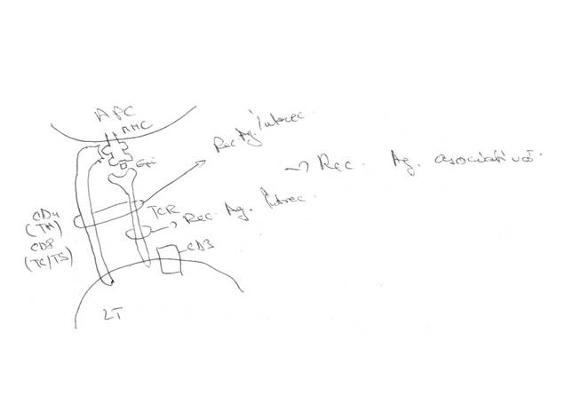 Din a. si b. => recunosc simultan atat Ag prezentat cat si moleculele prezentatoare ale acestora = recunoasterea Ag asociativa (reprezinta si principala cale de activare metabolica a LT)