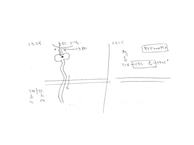 in timpul cooperarii se stabilesc legaturi intre CD28 si un contraligand (CD80) - prezent NUMAI pe suprafata APC profesionale => semnale activatoare care se trimit catre profunzime, ele contand enorm pentru maturarea functionala a TH/TC