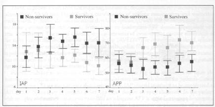 Figura 2. Evolutia IAP si APP la pacientii cu insuficienta renala acuta clasificati in supravietuitori si nesupravietuitori.