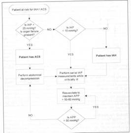 Coreland rezultatele studiilor de mai sus cu literatura deja disponibila referitoare la consecintele fiziopatologice ale IAH si managementul ACS, se poate propune un algoritm pentru managementul adecvat al pacientului cu IAP crescuta (Figura 3).