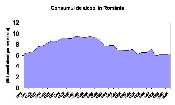 Consumul de alcool la noi in tara a inregistrat valori crescute in perioada 1975-1985. Din 1985 pana in 1995, consumul de alcool scade treptat, urmand ca din 1996 pana in prezent sa se inregistreze un trend progresiv ascendent anticipand cresterea incidentei patologiei legate de alcool in anii urmatori.