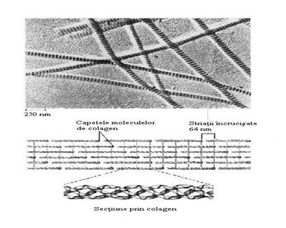 Studiile de microscopie electronica au evidentiat aranjamentul repetitiv cap-coada al helixului, ce prezinta din loc in loc regiuni "goale" (hole zone) (Fig.13). In aceste regiuni se pot lega fie catene glucidice ce interactioneaza cu hidroxilisina prin glucoza sau galactoza si care au rol in asamblarea fibrilei fie microcristale de hidroxiapatita pentru mineralizarea osului, dintilor.