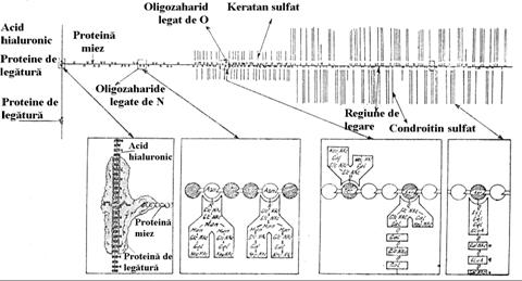 Proteoglicanii continand condroitin sulfati se asociaza prin intermediul unor proteine de legatura cu acidul hialuronic, formand agregate supramoleculare de dimensiuni foarte mari (circa 100 molecule de proteoglicani per molecula de acid hialuronic), cu masa moleculara de ordinul sutelor de milioane (Fig.5.11). Proteina din miezul agrecanului este una dintre cele mai mari proteine avand masa moleculara de 250-300 kDa.