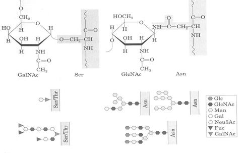 Glicoproteinele pot fi impartite in doua clase in functie de natura legaturii dintre lantul polipeptidic si lantul oligoglucidic (Fig.5.13):