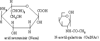 Acidul N-acetil neuraminic se gaseste mai ales la capatul lantului legat, cel mai adesea, de galactoza sau N-acetil-galactozamina.