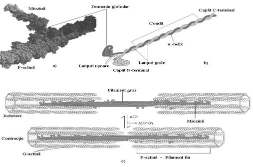Interactiunea actinei cu miozina se face prin legaturi slabe si numai in absenta ATP. Legarea ATP la regiunea globulara a miozinei determina o serie de modificari conformationale care au ca rezultat detasarea acesteia de F-actina din vecinatate si legarea ei de o alta molecula aflata la distanta in filamentul fin, determinand deplasarea filamentului gros de-a lungul filamentului fin (Fig.11c).
