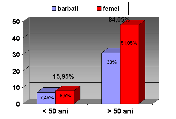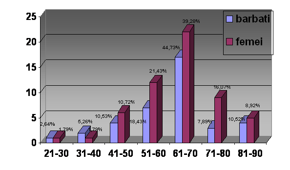 Incidenta maxima a afectiunii se situeaza in decada a-VII-a de viata, urmata de decadele VI si VIII. Majoritatea pacientilor au avut peste 50 de ani 84,05 %, dintre care 31 barbati (39%) si 48 femei (61%).
