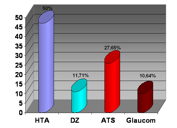 Factori de risc 50 % din totalul de 94 de pacienti au avut hipertensiune arteriala, 27 % ateroscleroza, 12 % diabet zaharat si 11 % glaucom. Constatam ca factorul etiologic principal este HTA, urmata de ATS, si diabetul zaharat, desi trebuie mentionat ca nu se cunoaste cu certitudine daca glaucomul este o cauza a OVR-ului sau o complicatie a acestuia.