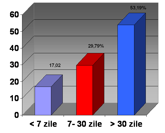Adresabilitatea scazuta - Din lotul de 94 pacienti constatam ca doar 17 % s-au prezentat la medic la mai putin de 7 zile de la debutul bolii, 30% s-au prezentat intre 7-30 zile si majoritatea de 53% s-au prezentat la peste 30 zile observandu-se o prezentare tardiva a pacientilor la medic, ceea ce a influentat semnificativ si procentajul legat de AV, cazurile prezentate fiind in special cele cu deficiente vizuale majore.