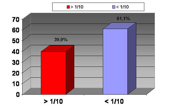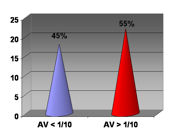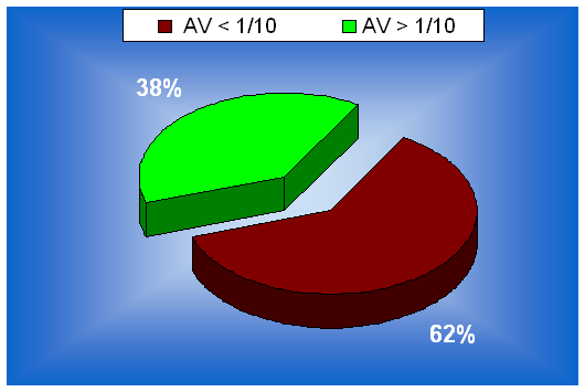 masurarea acuitatii vizuale arata ca 61,7 % din lotul studiat au avut acuitatea vizuala mai mica de 1/10 si doar 38,3 % au avut acuitatea vizuala mai mare de 1/10.