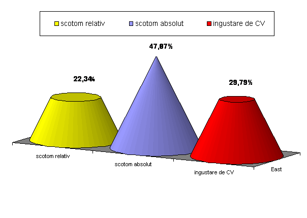 Campul vizual - constatam ca 22,34%, din totalul de 94 de pacienti au avut scotom relativ, 47,87% au avut scotom absolut si 29,79% au prezentat ingustare de camp vizual.