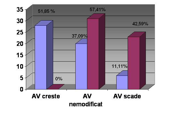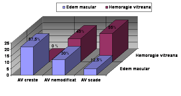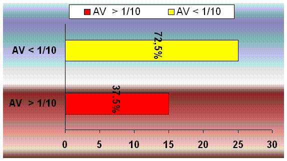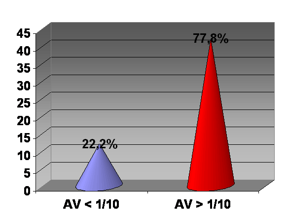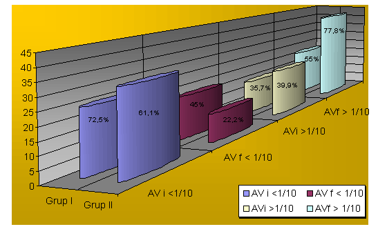 Am studiat evolutia acuitatii vizuale pre si posttratament (tabele 3.3.9-12, grafice 3.3.9-12), care au aratat la prezentare o acuitate vizuala inainte de tratament mai mica de 1/10 la 25 pacienti (72,5%) din primul grup fata de 33 pacienti (61,1 %) din grupul doi si o acuitate vizuala mai mare de 1/10 la 15 pacienti (37,5 %) din primul grup si 21 pacienti (39,9 %) din grupul doi, dar acuitatea vizuala finala, posttratament a fost mai mica 1/10 la 18 pacienti (45 %) din primul grup si 12 pacienti (22,2 %) din grupul doi si o acuitate vizuala mai mare de 1/10 la 22 pacienti (55 %) din primul grup si 42 pacienti (77,8 %) din grupul doi.