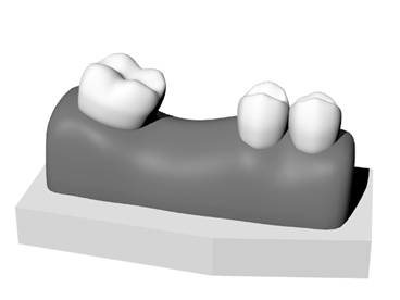 Reconstructia protetica cu dubla coroana a pilierului cel mai apropiat de zona candidata la o viitoare proteza, permite integrarea protezei executate intr-un prim stadiu, sacrificandu-se doar matricea singurei parti construite cu o dubla structura. Lipsa primului premolar presupune pregatirea celor doua elemente alaturate pilierilor de punte. Daca elementele reziduale sufera afectare parodontala avansata, utilizand si o printr-o proteza acrilica, nu trebuie exclusa necesitatea unei blocari de tip protetic care sa includa si elementele dentare, pilieri ai actualei proteze. Pe elementele pregatite se realizeaza o constructie protetica conjuncta, cu aspect normal, constituita dintr-o coroana dubla pe elementul mezial.