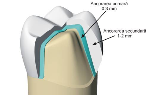 Grosimea ancorarii primare ajunge in general la aproximativ 0,3 mm. Altfel, va trebuie sa se reduca mai mult din pilier. Reducerea totala va fi in functie de tipul de ancorare secundara, variind de la minim in cazul unei coroane foarte subtiri, pana la maxim, in cazul unei coroane de aur-portelan pentru zonele posterioare. Valorile de care trebuie sa se tina cont sunt urmatoarele: