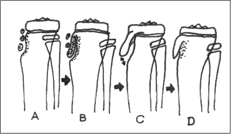 decalcificarea fetei corespunzatoare a metafizei si departarea varfului tuberozitatii tibiale care ia aspect "in trompa de tapir"