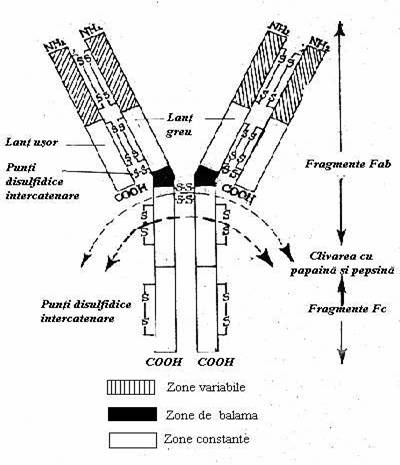 Dupa compozitia in aminoacizi, lanturile H si L sunt formate din doua domenii: variabil (V), la extremitatea aminoterminala si constant (C) la extremitatea carboxilica. Secventa de aminoacizi din compunerea domeniilor V difera de la o molecula la alta. Diferentele sunt maxime in trei puncte ale secventei - zonele 'hipervariabile' care formeaza situsul combinativ cu antigenul. Domeniile C sunt cele care caracterizeaza lanturile gama, kapa sau lambda. Exista patru variante de lanturi gama (gama 1 gama 4) care definesc patru subclase de IgG (IgG1.IgG4). Papaina ataca moleculele de IgG in amonte de legatura -S-S- care uneste cele doua lanturi H. Rezulta doua fragmente Fab (ab = 'antigen binding') care contine secvente combinative cu Atg. si un fragment Fc (c = 'cristalizabile') care constituie elementul efector al moleculei (fixarea complementului si fixarea pe celule care poseda receptori specifici pentru Fc). (Fig. 17).