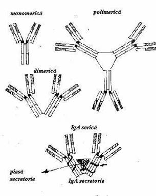 Exista doua subclase de IgA (alfa 1 si alfa 2). IgA serica poate fi monomerica, dimerica sau polimerica. Rolul sau nu este bine cunoscut. IgA secretorie este prezenta in concentratie ridicata in saliva, lapte, lacrimi, sputa sau secretii digestive. Este formata din doua unitati monomerice unite intre ele printr-o 'piesa secretorie' si un mic polipeptid (lantul J). (Fig.19)