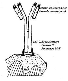 Celalalt pol denumit 'efector' are o structura constanta. El serveste pentru amorsarea activarii complementului prin calea clasica si pentru atasarea (imunoaderenta) la macrofage. Din punct de vedere biologic, Atc. sunt molecule adaptative bifunctionale. Ei servesc ca piese de legatura care mijlocesc atasarea Atg. pe fagocite. Atc. nu distrug antigenele, dar convertesc diversitatea materiala a antigenelor intr-un semnal unic si accesibil mecanismului ancestral de aparare care este fagocitoza.