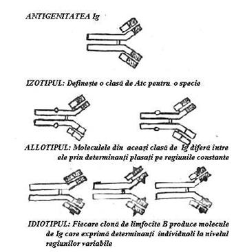 Ig reprezinta o situatie unica in biologie pentru ca sunt in acelasi timp si anticorpi si antigene (prin natura lor proteica se comporta ca imunogene care provoaca aparitia unor Atc anti - Ig). Acestia recunosc diversi epitopi ai moleculelor de lanturi H si L.