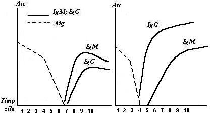 In cazul unei stimulari antigenice, organismul va reactiona prin sinteza de Atc., acest raspuns fiind cunoscut sub denumirea de raspuns primar. Prima categorie de anticorpi specifici care apar sunt anticorpii IgM, a caror crestere este de 80 molecule/sec. si au tendinta de epuizare rapida. Ulterior apare IgG a caror crestere este lenta si progresiva, cu tendinta deseori de descrestere. Daca organismul revine in contact cu acelasi Atg. apare raspunsul secundar (reactia anamnestica) in care cresterea IgM este neglijabila si se epuizeaza rapid, in timp ce anticorpii IgG cresc intens si rapid, atingand un nivel ridicat si persistent, urmata de scaderea lenta pana la un anumit prag de protectie imuna reziduala.