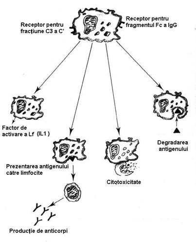 Mcf. poseda pe suprafata receptori pentru C' si pentru segmentul Fc al moleculelor de Atc. Cu ajutorul acestor receptori capteaza Atg. pe care s-au atasat C' si/sau Atc (imunoaderenta). Gratie imunoaderentei Mcf. elimina Atg. din organism.