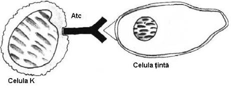 Tintele celulare cele mai variate, invelite prin concentratii scazute de anticorpi IgG, devin sensibile la efectul citotoxic al anumitor celule mononucleate, celulele K (de la engl. killer). Aceasta este citotoxicitatea celulara dependenta de anticorpi (ADCC- 'antibody dependent cell-mediated cytotoxicity').(Fig.38)