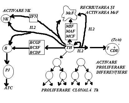 Exista o relatie dubla intre Mcf. si Lf : prin oferta de Atg. si prin secretia de interleukine (care creaza in plus efecte reciproce de activare). Astfel, ca raspuns la IL1, LfTh secreta o substanta stimulatoare (IL2) care produce activarea Mcf, a LfB si a diverselor subpopulatii de LfT (Th, Ts, Tc).
