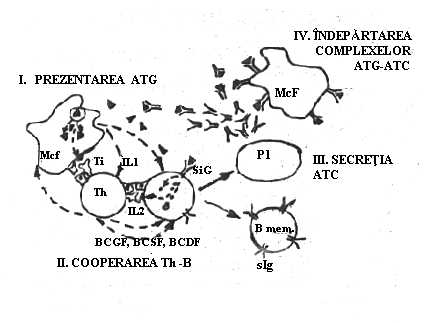 6. Amplificarea activarii, a proliferarii si a transformarii LfB, in plasmocite secretoare prin intermediul mai multor limfokine: IL2, factorul de stimulare, factorul de proliferare, factorul de diferentiere;