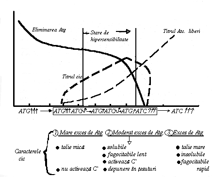 Complexele imune se formeaza in mod normal in cursul raspunsului humoral prin unirea Atc. cu Atg.. Proportia moleculelor de Atg si Atc. in aceste complexe variaza in timp, deoarece cantitatea globala a Atg. scade progresiv in timp ce titrul Atc. creste. Initial exista un exces de Atg. Complexele sunt mici si in cantitate redusa. Dupa cateva zile, cand Atc. ajung in exces, complexele apar ca agregate macromoleculare insolubile si precipitabile care sunt indepartate rapid de fagocite. Intre aceste doua extreme exista o perioada in care Atg. sunt in exces moderat. In cursul acestei perioade se formeaza complexele solubile de talie intermediara care pot activa complementul (Fig.72)