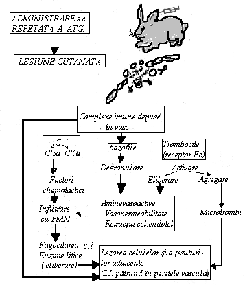 Activarea C' duce la formarea anafilatoxinelor C3a si C5a cu efect chemotactic intens asupra polimorfonuclearelor neutrofile (PMN). PMN infiltreaza puternic peretele vascular unde ingera o parte din CI si elimina enzime care produc leziuni necrotice vasculare.