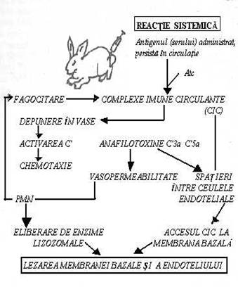 In aceasta reactie Atg. persista in circulatie unde se cupleaza cu Atc. pe masura aparitiei acestora. Complexele circulante se depun in vasele diverselor tesuturi unde determina hiperplazia endoteliului, hiperpermeabilitate si leziuni necrotice. Patogeneza leziunilor o aminteste pe aceea a reactiei Arthus (Fig.75):
