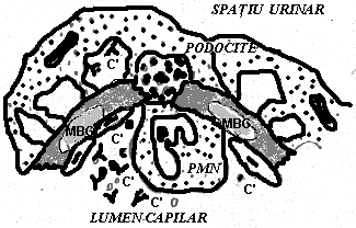 complexele solubile de talie mica se depun preferntial pe versantul extern al membranei bazale, producand o glomerulonefrita cu depozite extramembranoase. Accesul CI la membrana bazala glomerulara (MGB) este facilitat de 2 factori care permit un contact nemijlocit intre MGB si sangele glomerular; existenta normala a unor pori in stratul de celule endoteliale (reamintim ca celulele endoteliale care formeaza peretii capilarelor glomerulare sunt dispuse pe fata interna a MGB) si contractia celulelor endoteliale produsa de amine vasoactive, care mareste spatiile dintre aceste celule (Fig.76)