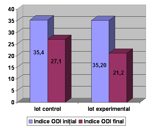 Indicele Oswestry s-a imbunatatit la ambele loturi, insa cu o diferenta considerabila la lotul experimental in comparatie cu lotul de control: