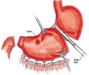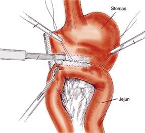 Un stapler Endo-GIA de 30 mm este introdus prin aceste doua orificii, cu un brat in stomac si celalalt in jejun. Staplerul este inchis, apoi, cu ajutorul bisturiului staplerului, se sectioneaza peretele gastric si jejunal la nivelul anastomozei. Dupa extragerea staplerului, anastomoza este examinata introducand laparoscopul prin orificiile prin care s-a introdus si staplerul. Cu a doua aplicare a staplerului se realizeaza mai usor gastroenteroanastomoza pe o lungime de 6 cm.