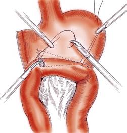 Cea mai rapida este sutura cu staplerul (Fig. 18). Pentru aceasta, se vor practica doua orificii prin diatermocoagulare la nivelul stomacului si a jejunului, apropiate una de alta, in partea dreapta a viitoarei linii de anastomoza. Aceste orificii pot fi sursa unei sangerari care poate fi oprita prin electrocoagulare.