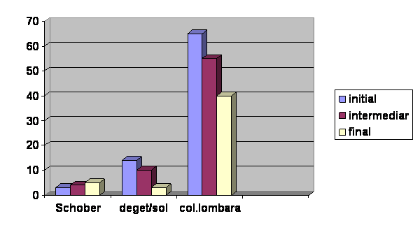 In urma tratamentului aplicat durerile au cedat, coloana s-a redresat ceea cea permis sa continue activitatea profesionala, dar in limitele unor posibilitati fizice de care dispune organismul ei (graf. 7 si 8). Pentru lucrul independent i s-a recomandat un program kinetic efectuat zilnic, reducerea eforturilor fizice si a ortostatismului prelungit.