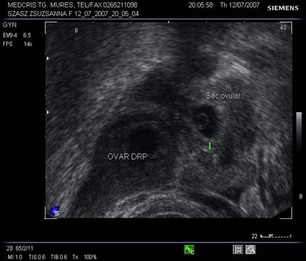 Fig nr 55 Langa ovarul stang, o formatiune ovalara ( intre calipere ) de 18 mm, cu ecou hipoecogenic central, la 6 sapt.de amnoree