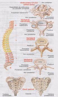 Este alcatuita din 33-34 vertebre articulate prin discurile intervertebrale: 7 cervicale, 12 toracice, 5 lombare, 5 sacrale si 4-5 coccigiene
