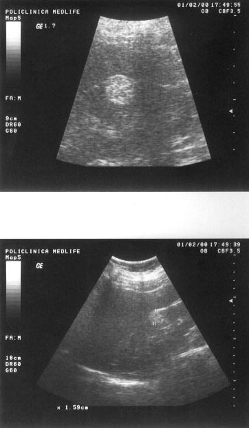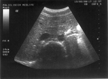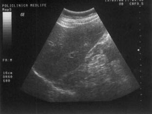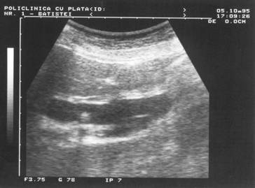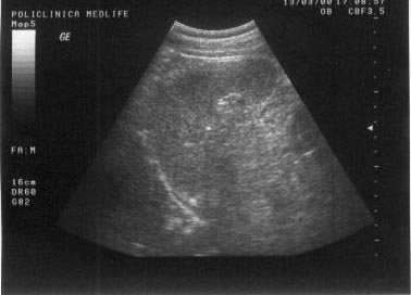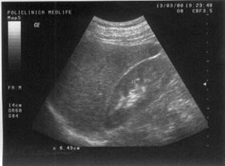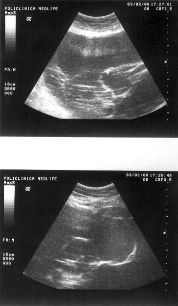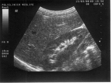 Figura 9. In mod normal, parenchimul renal este mai hipoecogen decat perenchimul hepatic.