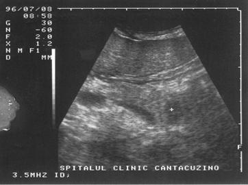 rinichiului drept, mica zona hiperecogena, rotunda, care deformeaza conturul