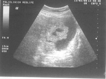 Imaginea "in cocarda" este o imagine rotunda, are centrul hiper/izoecogen, inconjurat de o arie circulara hipoecogena.
