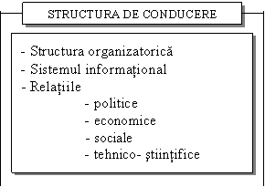 Sistemul de conducere (Schema nr.2 cuprinde o componenta constructiva - structura de conducere si o componenta functionala - procesul de conducere[3]. Structura de conducere a sistemului asigura cadrul de exercitare a procesului de conducere.