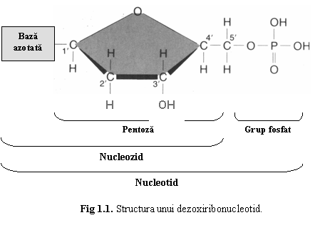 ADN este un polimer de dezoxiribonucleotide. Unitatea structurala a ADN este dezoxiribonucleotidul, avand in componenta trei elemente distincte: o pentoza, o baza azotata si grupul fosfat (figura 1.1).