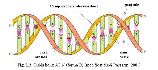 Molecula de ADN este constituita din doua catene polinucleotidice care formeaza un dublu helix (figura 1.2). Catenele sunt conectate intre ele prin intermediul legaturilor de hidrogen: doua intre A si T si trei intre G si C. Formarea legaturilor de hidrogen este posibila numai intre o baza purinica de pe o catena si o baza pirimidinica de pe catena opusa. Astfel, cele doua catene ale ADN nu sunt identice, ci complementare. Legea complementaritatii bazelor azotate sta la baza realizarii functiilor genetice ale ADN: replicarea, transcrierea, etc.