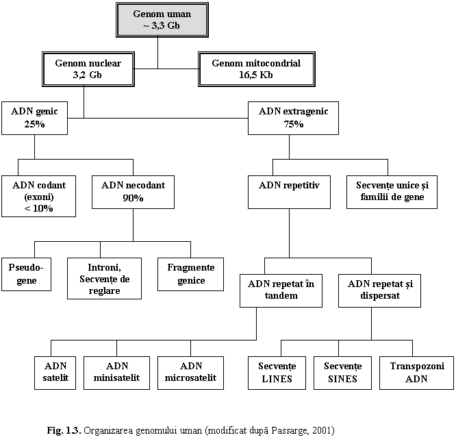 Genomul nuclear cuprinde 20.000-25.000 de gene si are o lungime de 3,2 Gb. Contine peste 99% din ADN celular (figura 1.3).