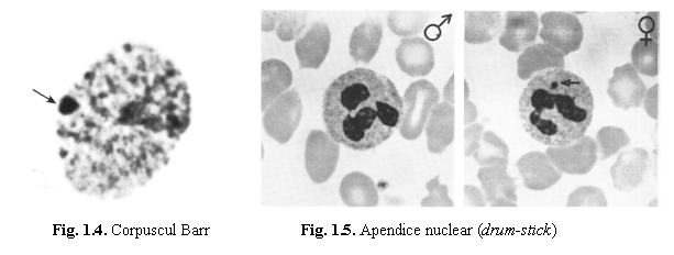 La femei (XX), cromatina sexuala rezulta in urma inactivarii unuia din cei doi cromozomi X. Cromozomul X condensat (heterocromatinizat) este vizibil sub forma de corpuscul Barr in majoritatea tesuturilor (figura 1.4) sau sub forma de apendice nuclear (drumstick - bat de toba) pe frotiuri de sange, in polimorfonuclearele neutrofile (figura 1.5). Astfel, atat la femeie cat si la barbat, un singur cromozom X ramane activ, iar cromozomii X suplimentari sunt inactivati prin heterocromatinizare. Conform principiului Lyon, inactivarea cromozomului X este totala, se produce precoce in perioada embrionara si este definitiva; inactivarea cromozomului X se produce la intamplare, in unele celule fiind inactivat cromozomul X de origine paterna, iar in altele cel de origine materna.
