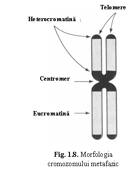 Analiza corecta a morfologiei cromozomilor este realizata in metafaza diviziunii, cand acestia sunt bine individualizati si se afla in acelasi plan (placa ecuatoriala). In acest stadiu, cromozomii sunt alcatuiti din doua cromatide unite la nivelul centromerului (cromozomi bicromatidici) si delimitate la capete prin telomere (figura 1.8).
